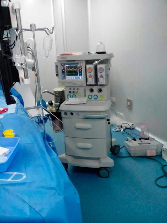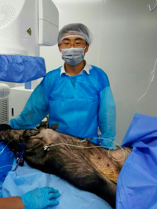 工程師安裝好麻醉機后和獸醫(yī)專家一起給豬做麻醉、手術