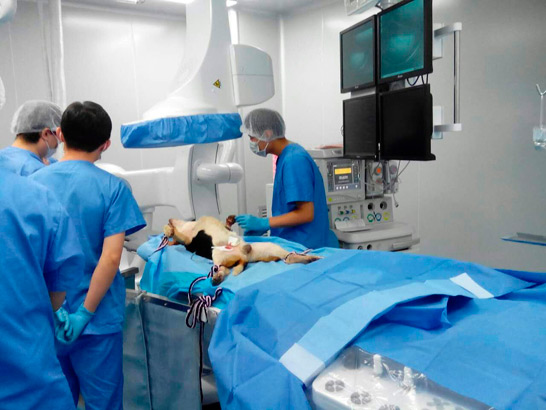 工程師安裝好麻醉機后和獸醫(yī)專家一起給狗做麻醉、手術